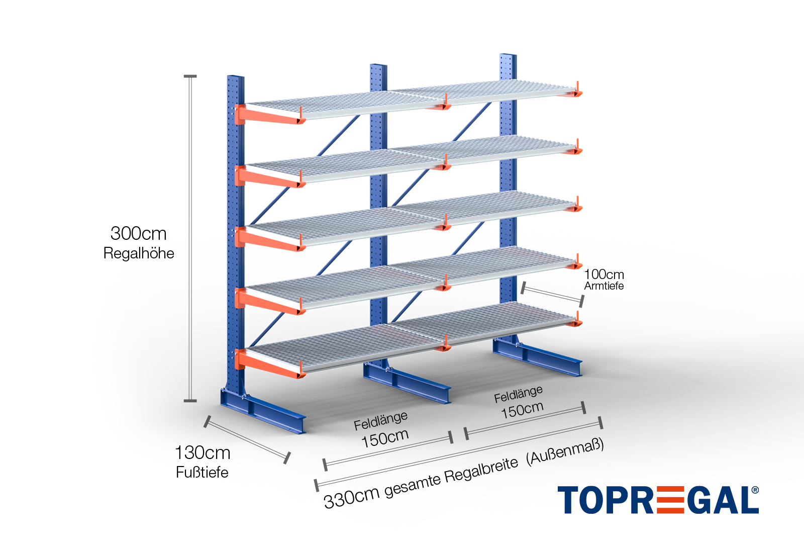 3,3 m cantilever rack KR3000 / Painted / One-sided / 3 m high / 5 levels / 100 cm cantilever depth / rack layer Galvanised mesh