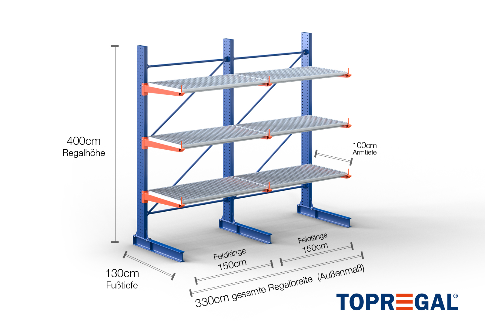 The axial dimension is the internal dimension between two shelf uprights. Depending on the cantilever type, we offer these fields in 120 cm (KR2500) and in 100 cm / 150 cm (KR3000 / KR6000).
