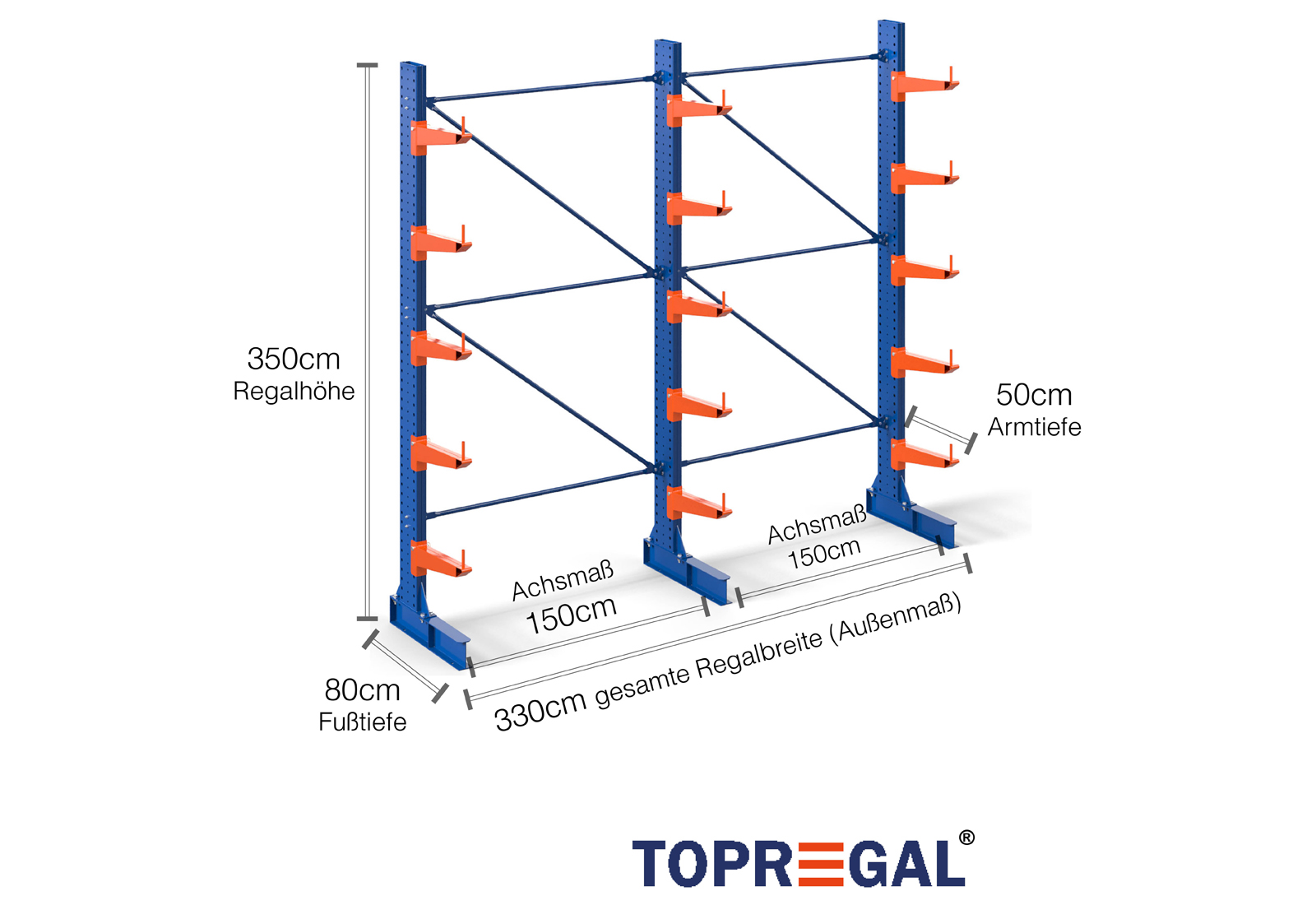 The axial dimension is the internal dimension between two shelf uprights. Depending on the cantilever type, we offer these fields in 120 cm (KR2500) and in 100 cm / 150 cm (KR3000 / KR6000).