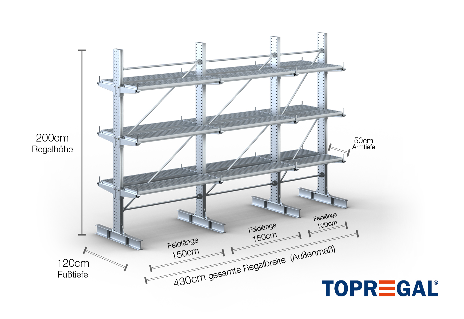 4,3 m cantilever rack KR3000 / Hot-dip galvanised / Double-sided / 2 m high / 50 cm cantilever depth / 3 levels / rack layer Galvanised mesh