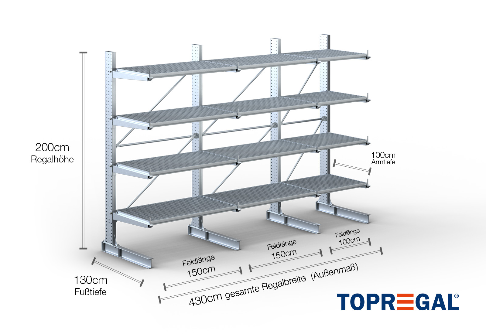 4,3 m cantilever rack KR3000 / Hot-dip galvanised / One-sided / 2 m high / 100 cm cantilever depth / 4 levels / rack layer Galvanised mesh