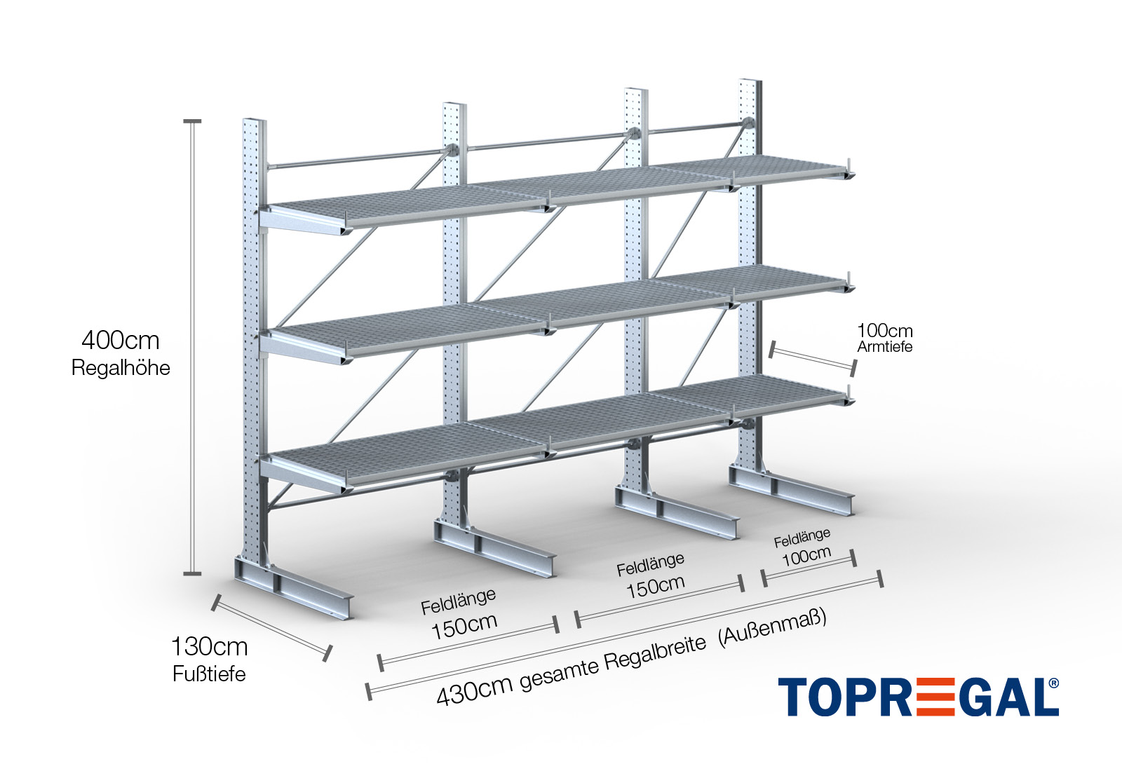 4,3 m cantilever rack KR3000 / Hot-dip galvanised / One-sided / 4 m high / 100 cm cantilever depth / 3 levels / rack layer Galvanised mesh