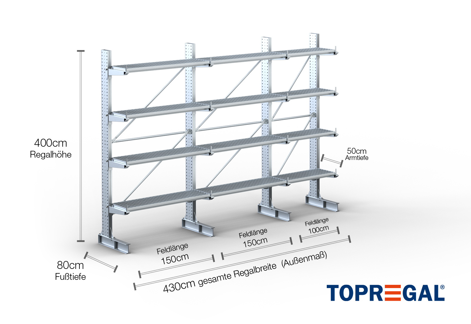 4,3 m cantilever rack KR3000 / Hot-dip galvanised / One-sided / 4 m high / 50 cm cantilever depth / 4 levels / rack layer Galvanised mesh