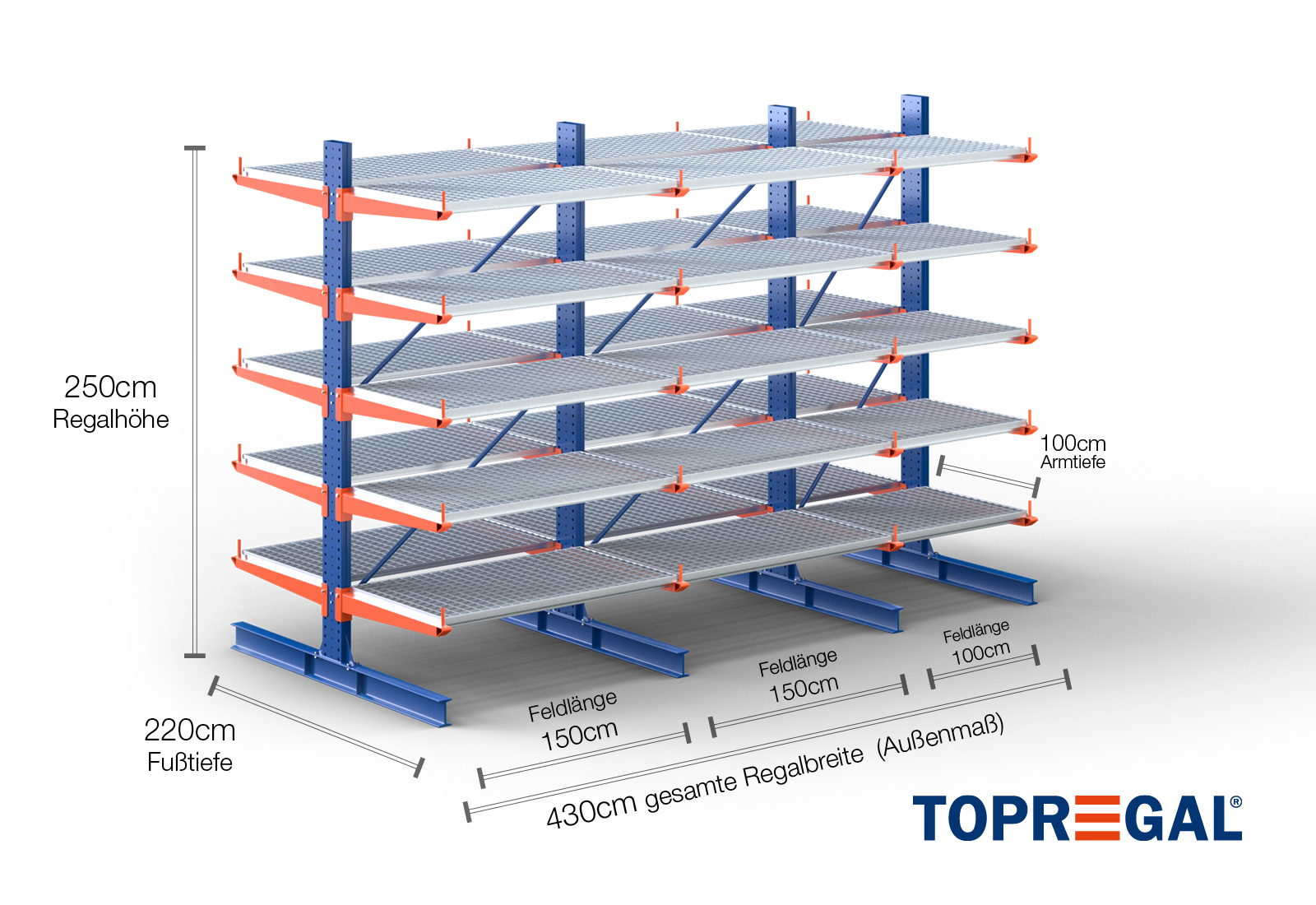 4,3 m cantilever rack KR3000 / Painted / Double-sided / 2,5 m high / 100 cm cantilever depth / 5 levels / rack layer Galvanised mesh