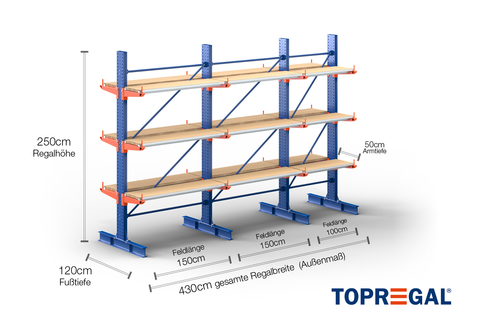 4,3 m cantilever rack KR3000 / Painted / Double-sided / 2,5 m high / 50 cm cantilever depth / 3 levels / rack layer Wood