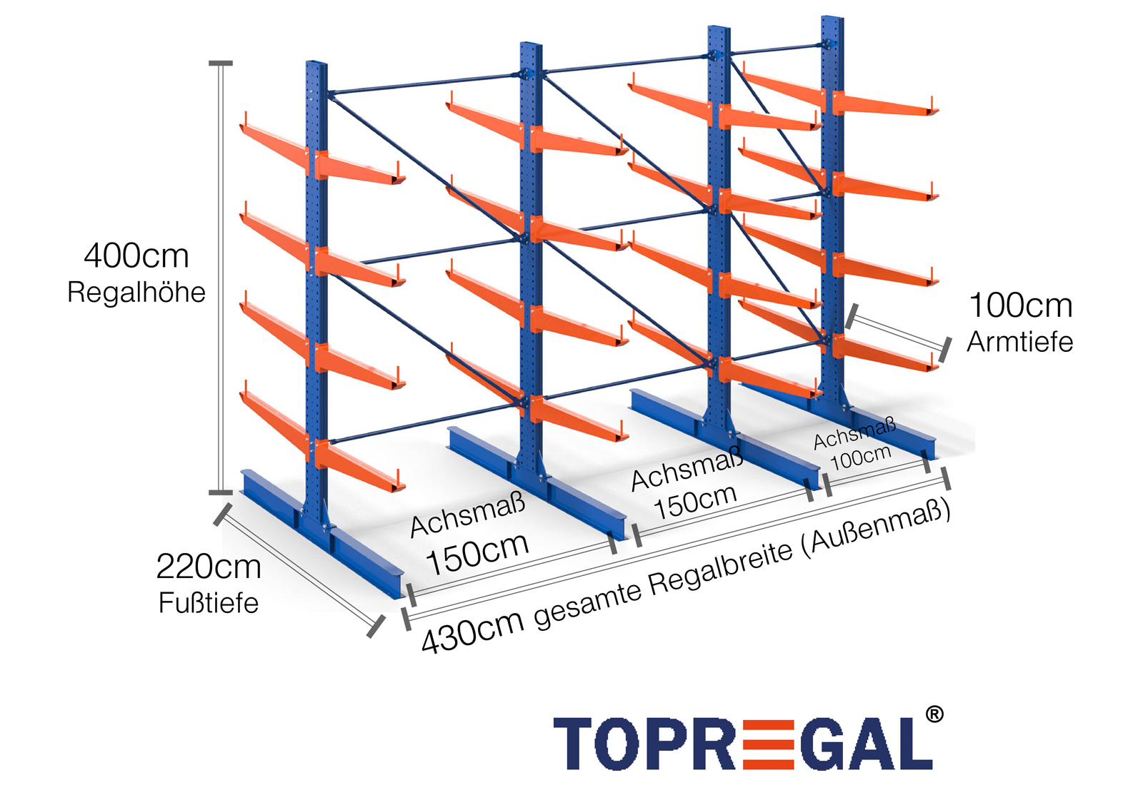 4,3 m cantilever rack KR3000 / Painted / Double-sided / 4 m high / 100 cm cantilever depth / 4 levels