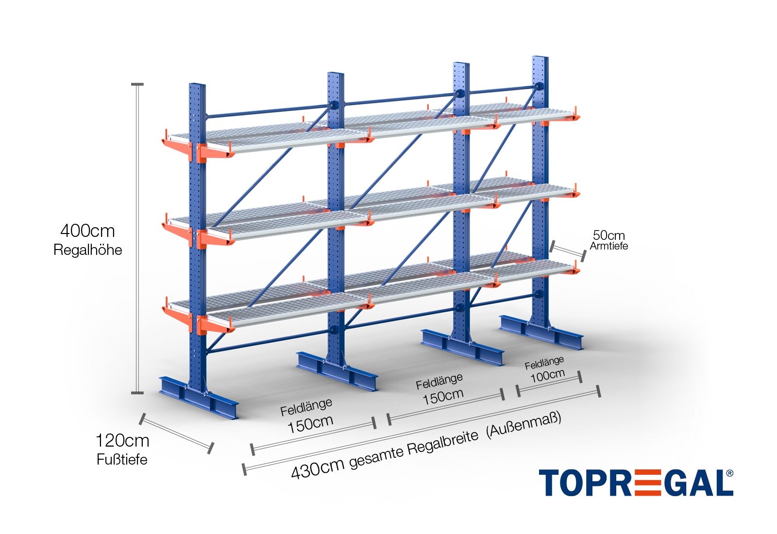 4,3 m cantilever rack KR3000 / Painted / Double-sided / 4 m high / 50 cm cantilever depth / 3 levels / rack layer Galvanised mesh