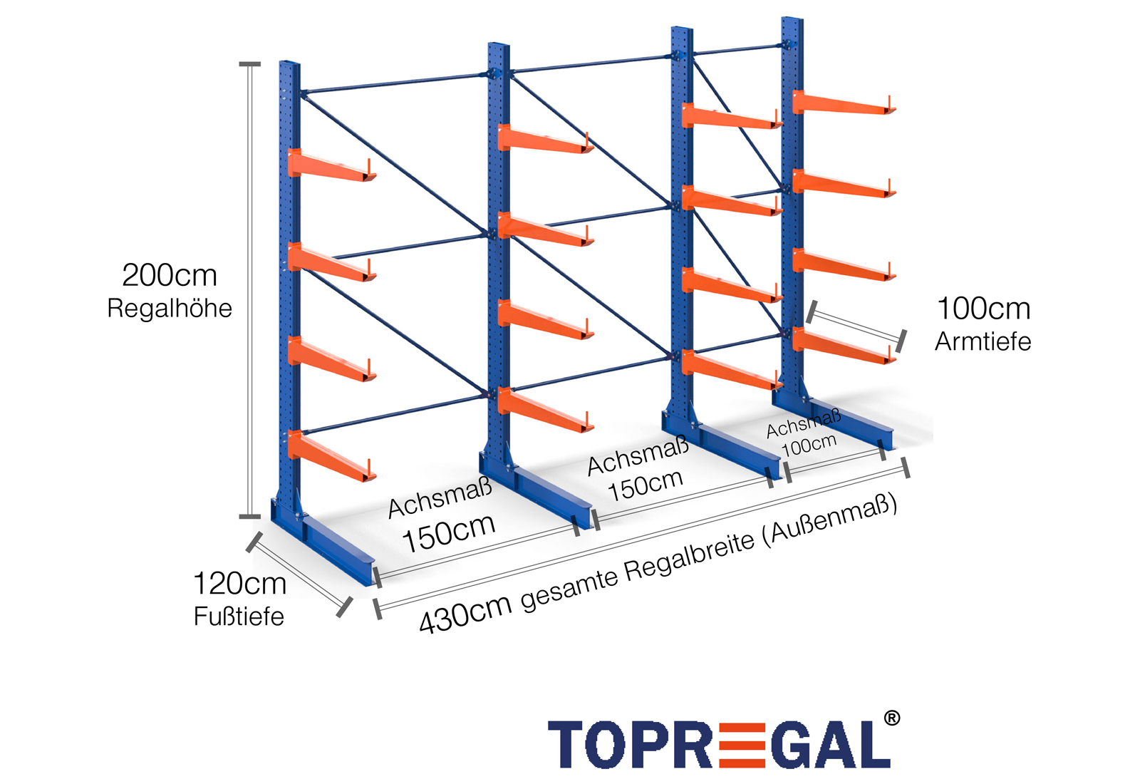 The axial dimension is the internal dimension between two shelf uprights. Depending on the cantilever type, we offer these fields in 120 cm (KR2500) and in 100 cm / 150 cm (KR3000 / KR6000).