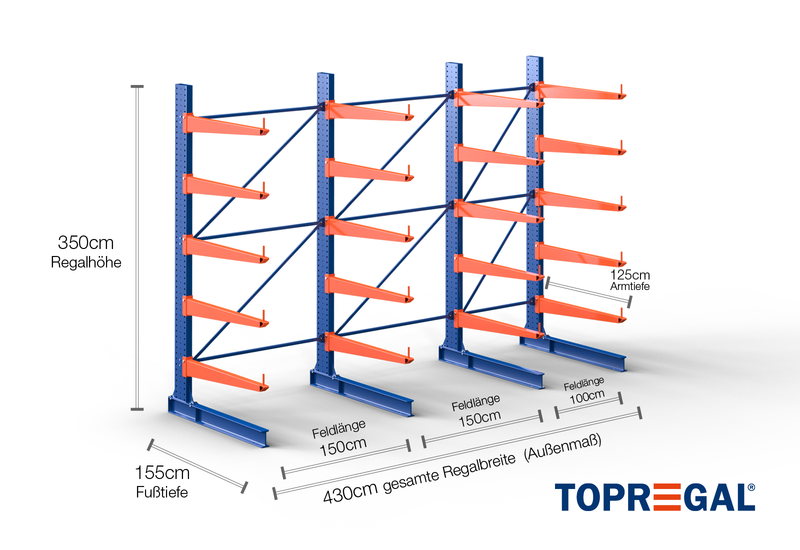 4,3 m cantilever rack KR3000 / Painted / One-sided / 125 cm cantilever depth / 3,5 m high / 5 levels