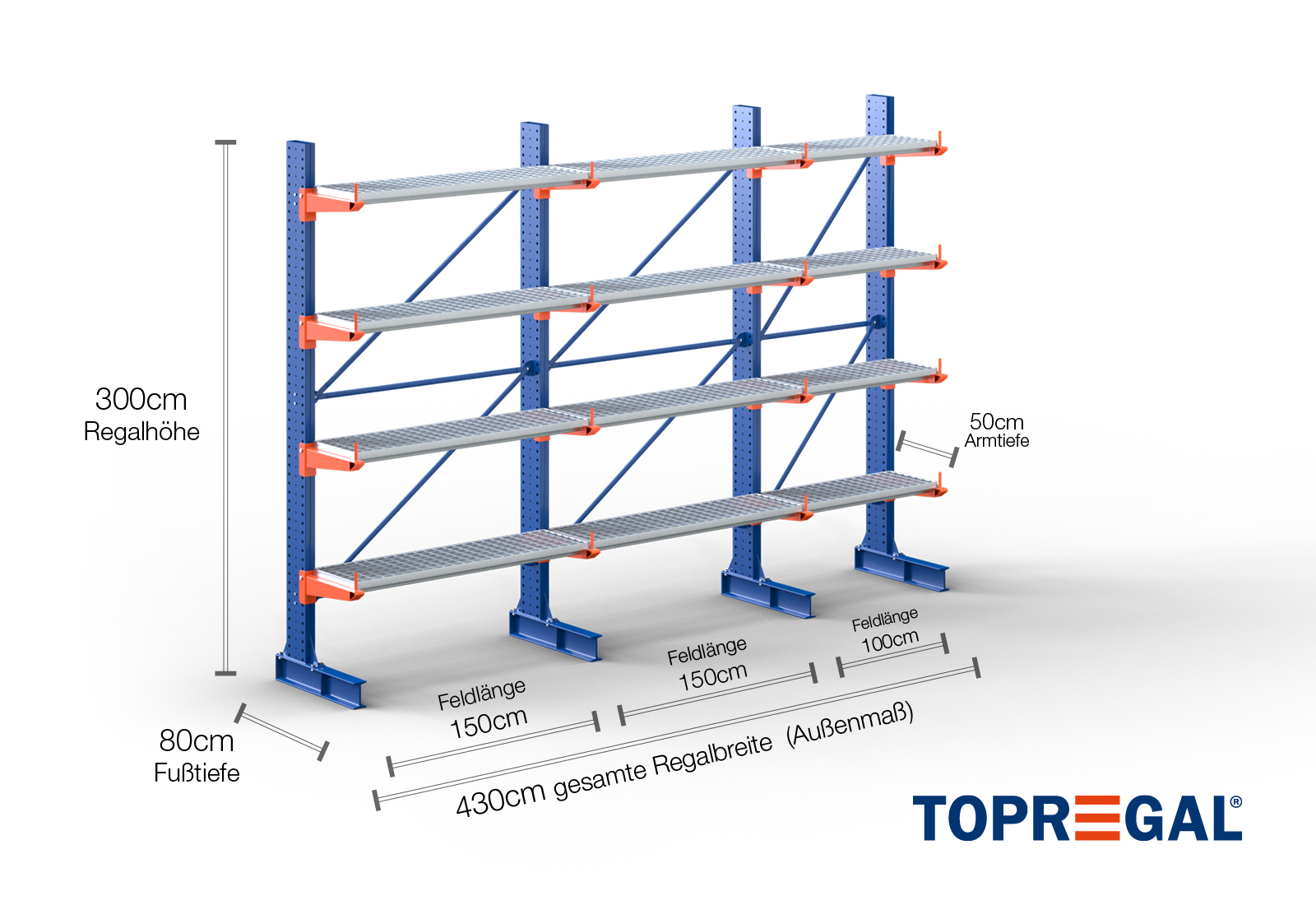 4,3 m cantilever rack KR3000 / Painted / One-sided / 3 m high / 4 levels / 50 cm cantilever depth / rack layer Galvanised mesh