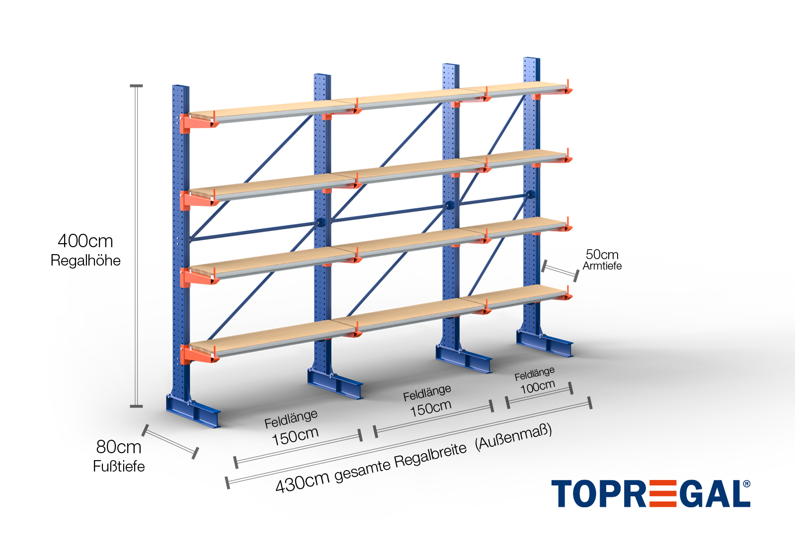 4,3 m cantilever rack KR3000 / Painted / One-sided / 4 m high / 50 cm cantilever depth / 4 levels / rack layer Wood