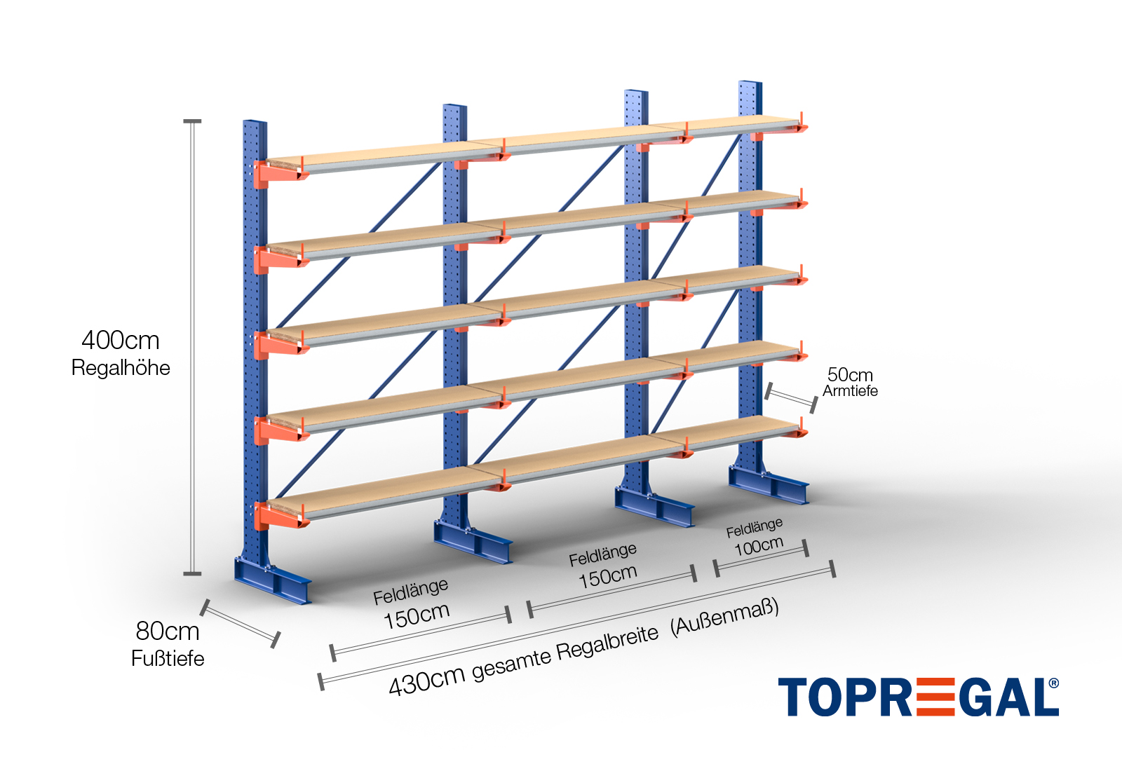 4,3 m cantilever rack KR3000 / Painted / One-sided / 4 m high / 50 cm cantilever depth / 5 levels / rack layer Wood