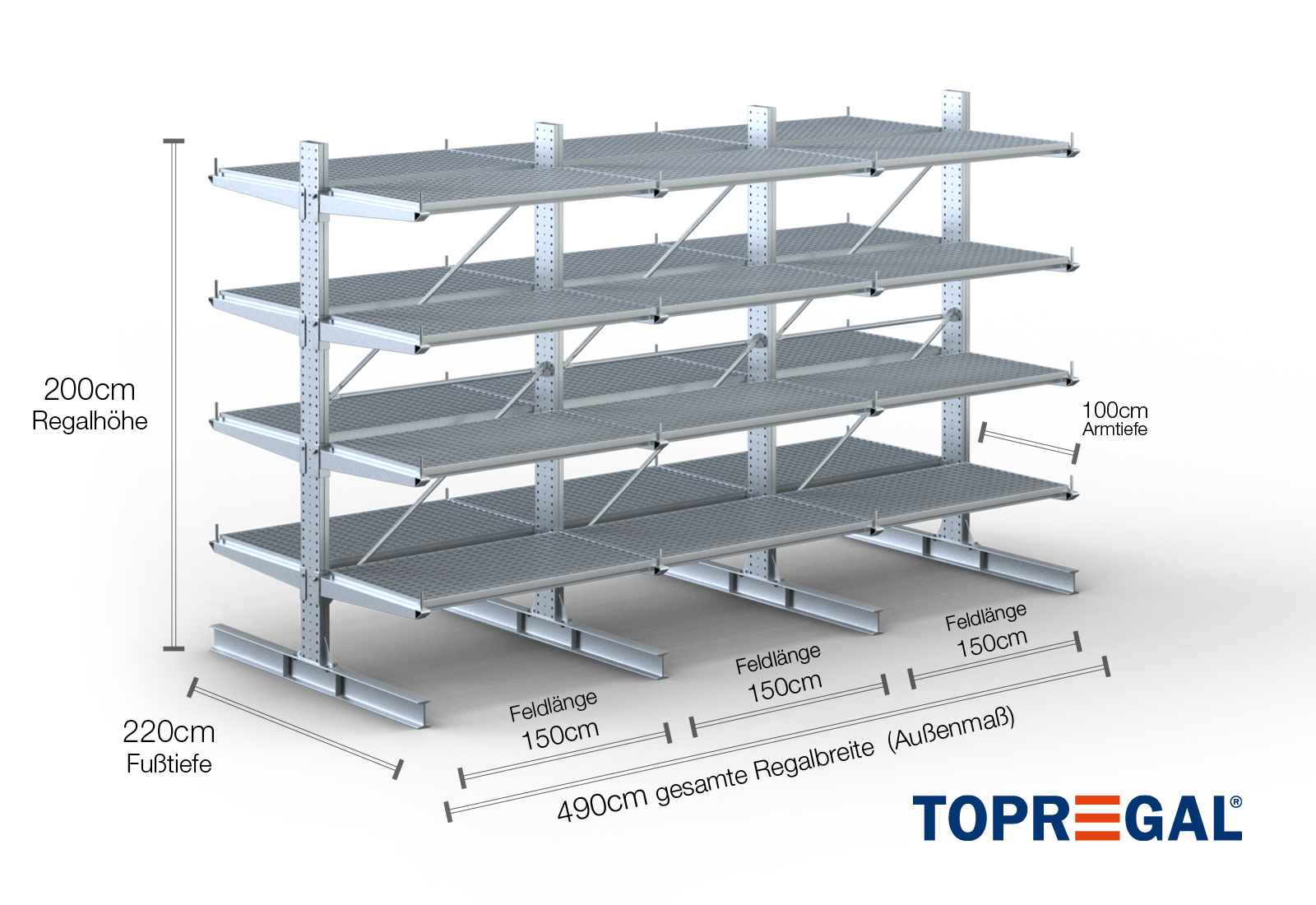 4,9 m cantilever rack KR3000 / Hot-dip galvanised / Double-sided / 2 m high / 100 cm cantilever depth / 4 levels / rack layer Galvanised mesh