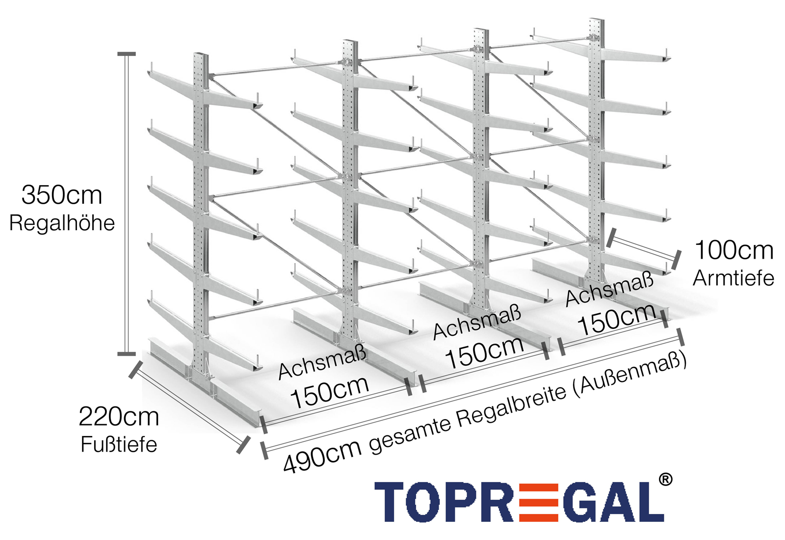 The axial dimension is the internal dimension between two shelf uprights. Depending on the cantilever type, we offer these fields in 120 cm (KR2500) and in 100 cm / 150 cm (KR3000 / KR6000).