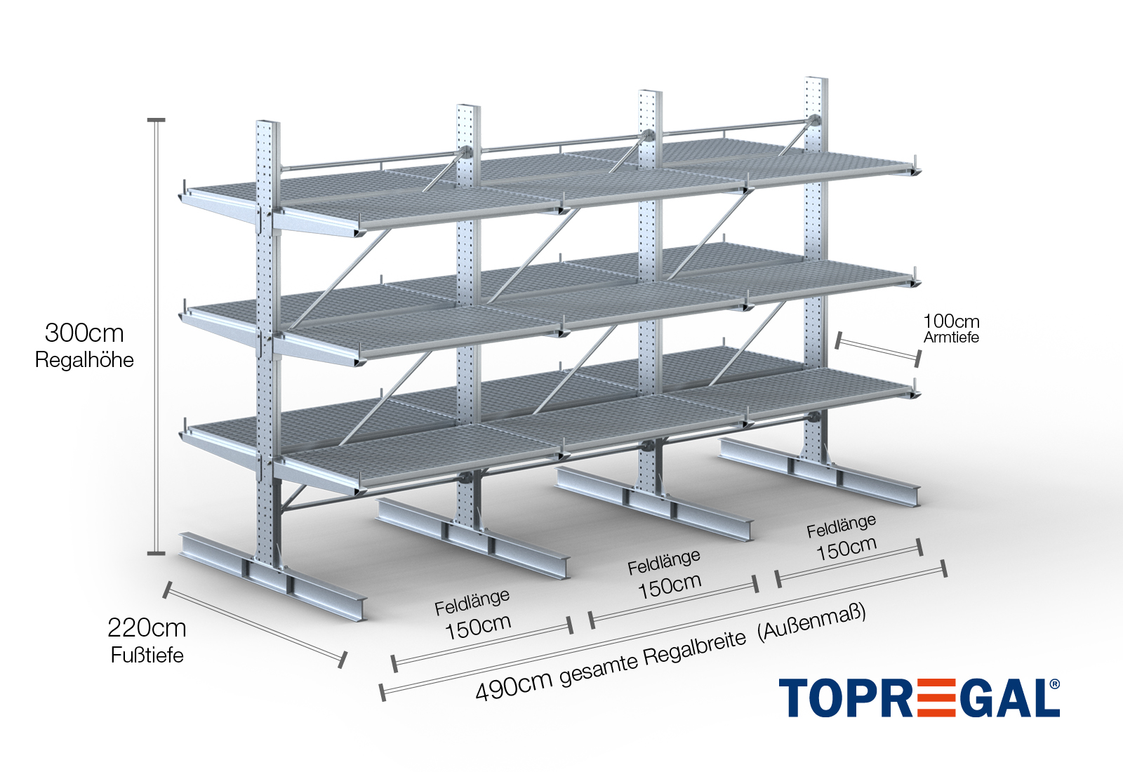 This cantilever rack in a double-sided design with a width of 4,9 m is 3 m high, with an overall depth of 220 cm, and features 3 cantilever levels, with a cantilever depth of 100 cm. The maximum load per cantilever is 500 kg. The cantilevers can be attached at individual heights in increments of 50 mm and are secured with safety bolts and pins. The foot parts can also be used as a storage level (depending on the goods). To protect the load from accidentally slipping, roll-off protection can be attached at the end of each cantilever. This is included as standard in the delivery volume. The maximum unit load capacity (even total load between two uprights) is 3.000 kg.