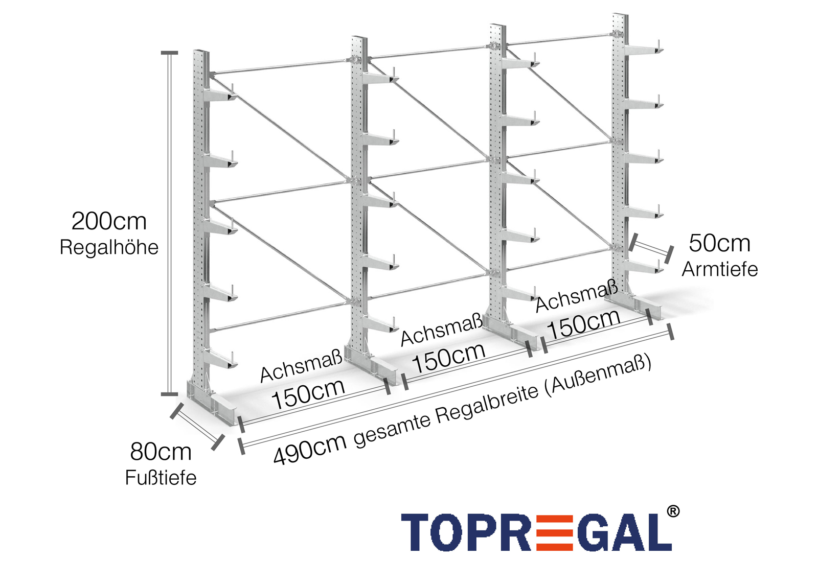 The axial dimension is the internal dimension between two shelf uprights. Depending on the cantilever type, we offer these fields in 120 cm (KR2500) and in 100 cm / 150 cm (KR3000 / KR6000).