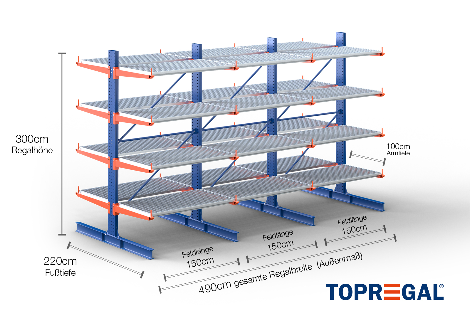 This cantilever rack in a double-sided design with a width of 4,9 m is 3 m high, with an overall depth of 220 cm, and features 4 cantilever levels, with a cantilever depth of 100 cm. The maximum load per cantilever is 500 kg. The cantilevers can be attached at individual heights in increments of 50 mm and are secured with safety bolts and pins. The foot parts can also be used as a storage level (depending on the goods). To protect the load from accidentally slipping, roll-off protection can be attached at the end of each cantilever. This is included as standard in the delivery volume. The maximum unit load capacity (even total load between two uprights) is 3.000 kg.