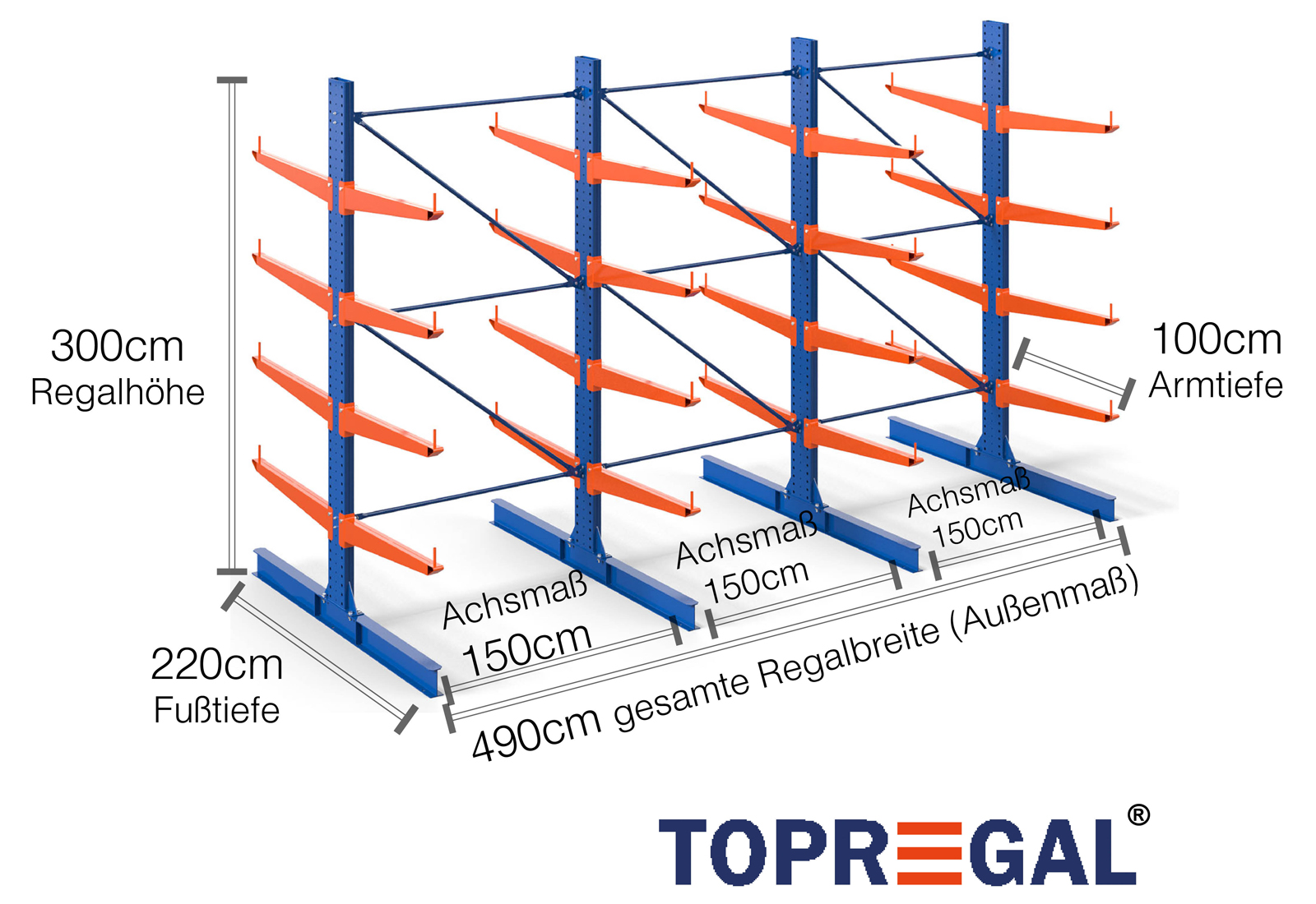 The axial dimension is the internal dimension between two shelf uprights. Depending on the cantilever type, we offer these fields in 120 cm (KR2500) and in 100 cm / 150 cm (KR3000 / KR6000).