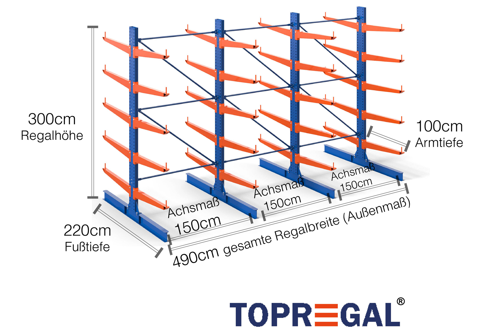 The axial dimension is the internal dimension between two shelf uprights. Depending on the cantilever type, we offer these fields in 120 cm (KR2500) and in 100 cm / 150 cm (KR3000 / KR6000).