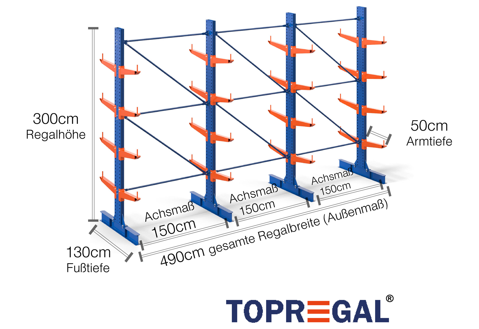 4,9 m cantilever rack KR3000 / Painted / Double-sided / 3 m high / 50 cm cantilever depth / 4 levels