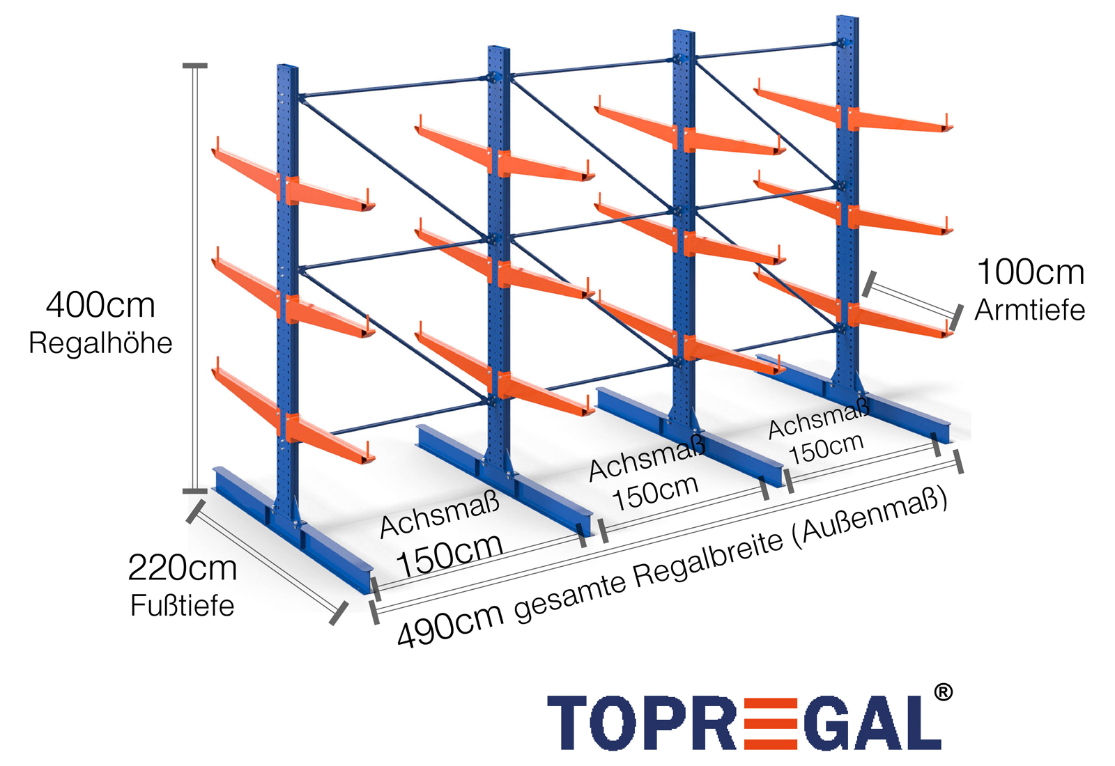 4,9 m cantilever rack KR3000 / Painted / Double-sided / 4 m high / 100 cm cantilever depth / 3 levels