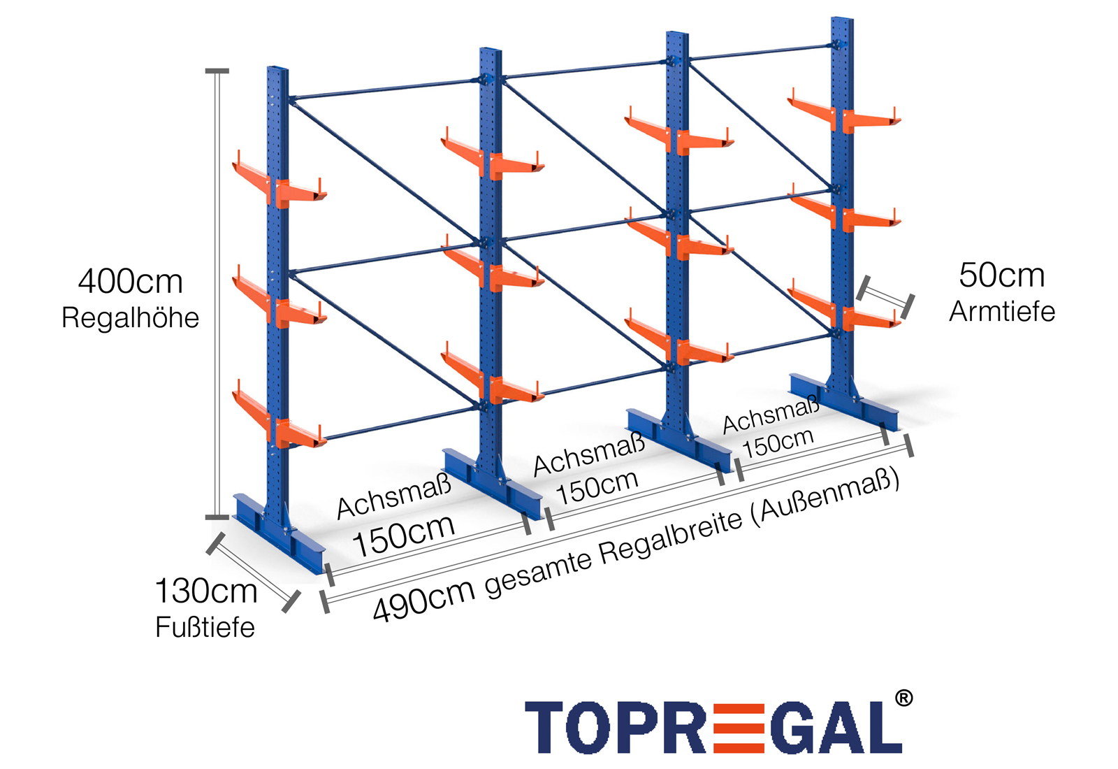 The axial dimension is the internal dimension between two shelf uprights. Depending on the cantilever type, we offer these fields in 120 cm (KR2500) and in 100 cm / 150 cm (KR3000 / KR6000).