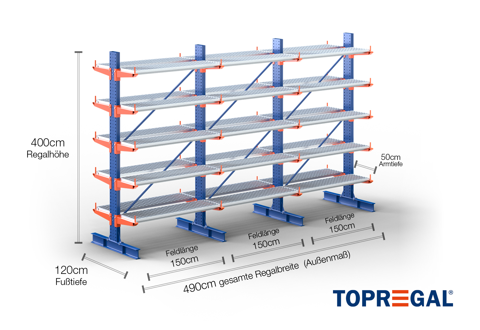 4,9 m cantilever rack KR3000 / Painted / Double-sided / 4 m high / 50 cm cantilever depth / 5 levels / rack layer Galvanised mesh