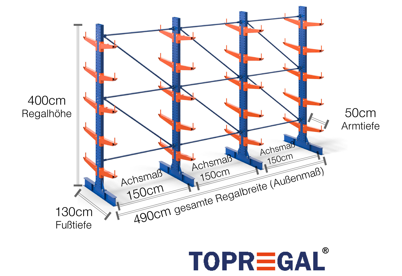 4,9 m cantilever rack KR3000 / Painted / Double-sided / 4 m high / 50 cm cantilever depth / 5 levels