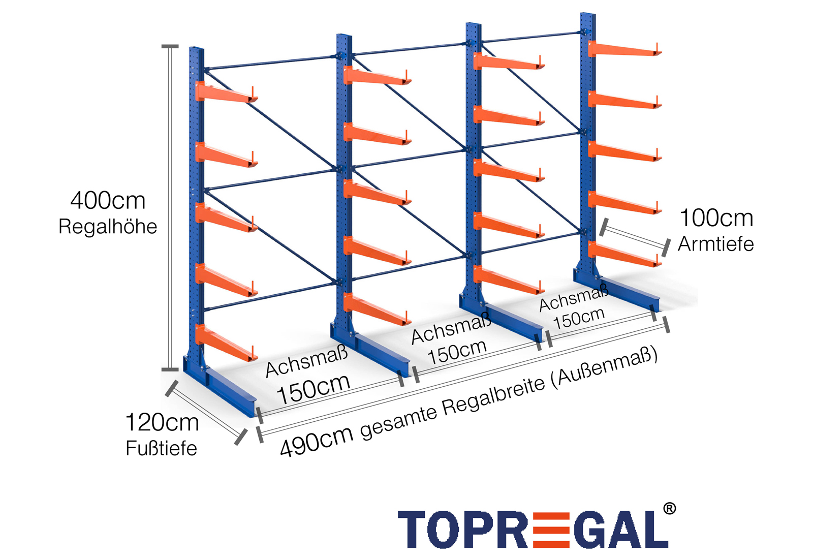 The axial dimension is the internal dimension between two shelf uprights. Depending on the cantilever type, we offer these fields in 120 cm (KR2500) and in 100 cm / 150 cm (KR3000 / KR6000).