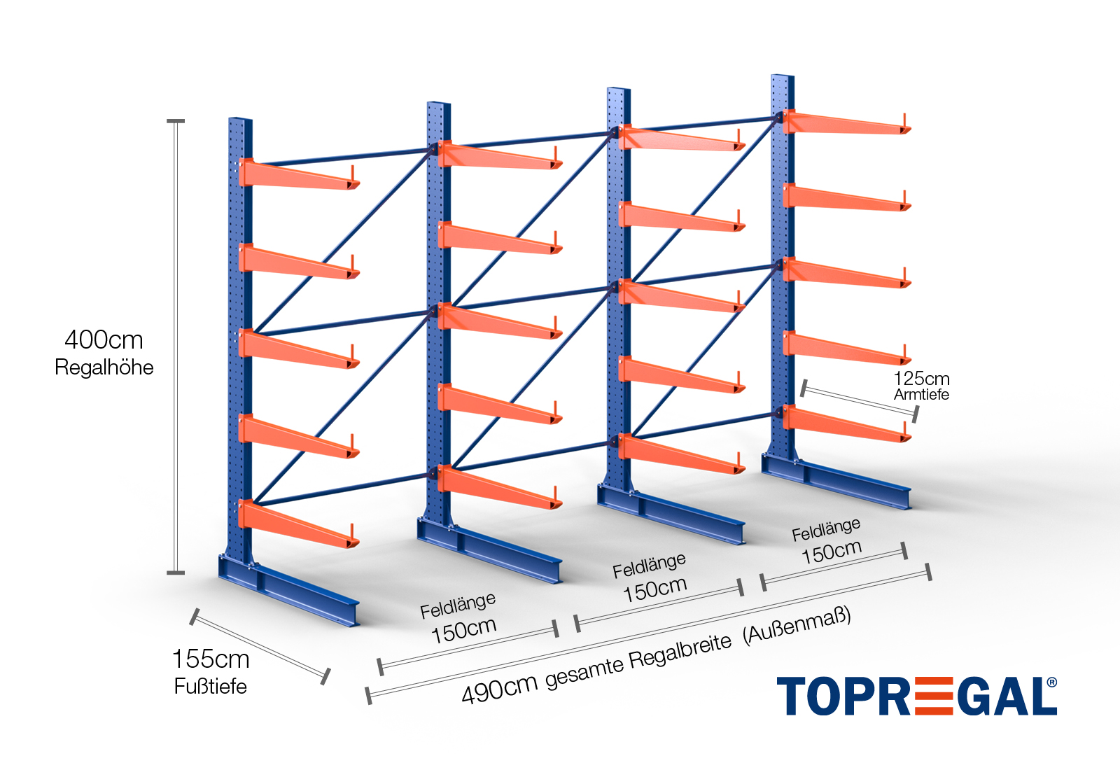 4,9 m cantilever rack KR3000 / Painted / One-sided / 125 cm cantilever depth / 4 m high / 5 levels
