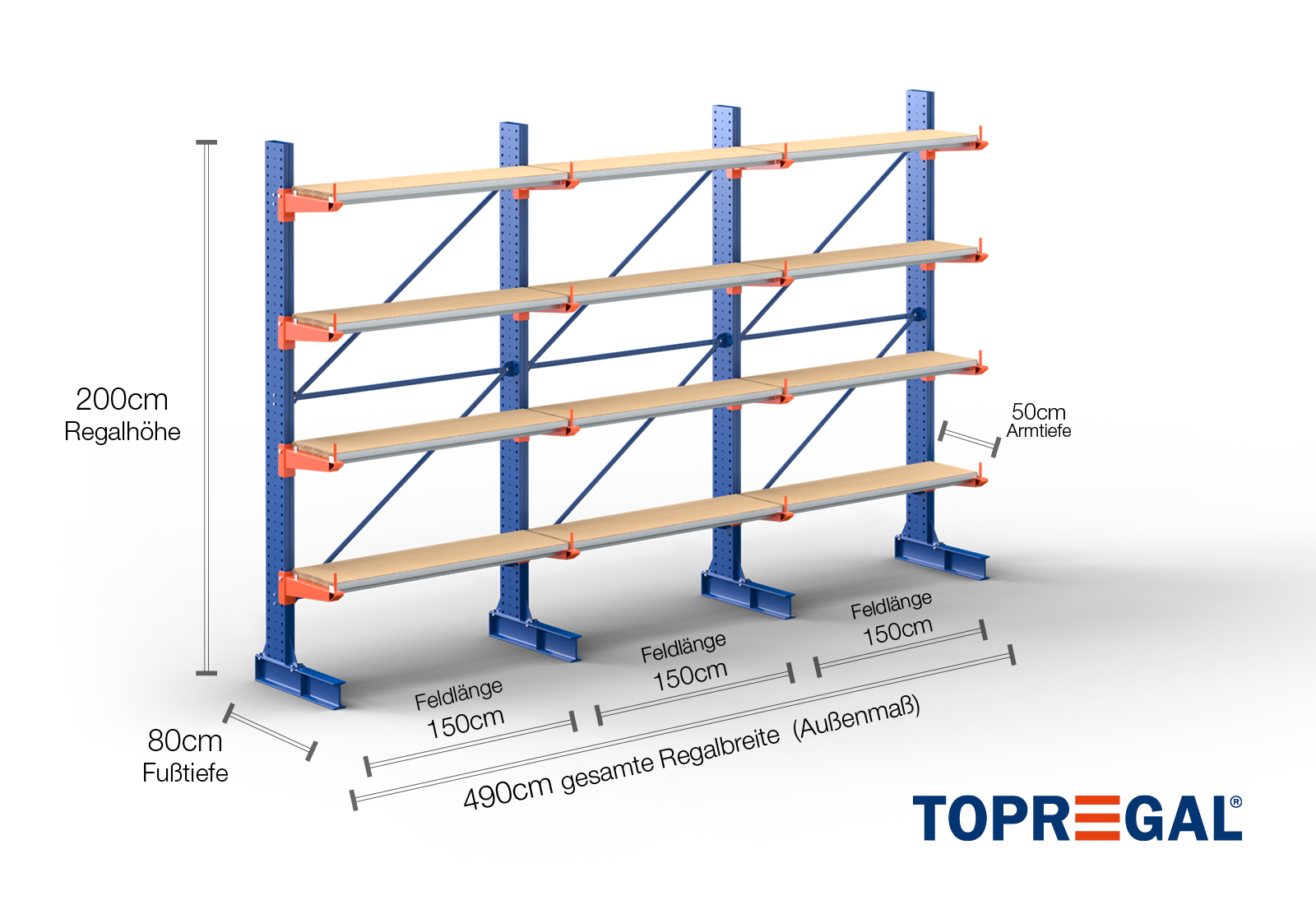 4,9 m cantilever rack KR3000 / Painted / One-sided / 2 m high / 50 cm cantilever depth / 4 levels / rack layer Wood
