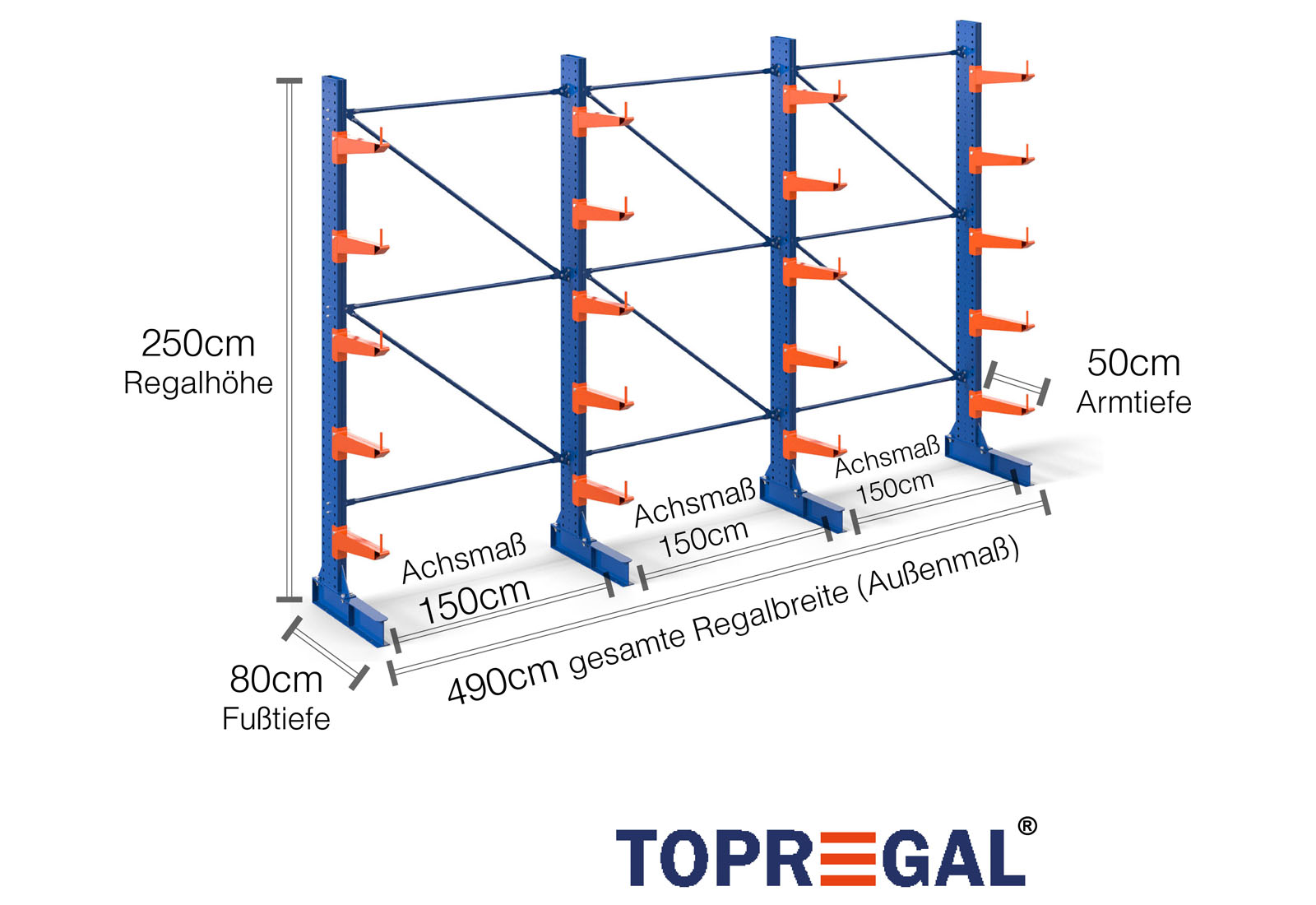 4,9 m cantilever rack KR3000 / Painted / One-sided / 50 cm cantilever depth / 2,5 m high / 5 levels