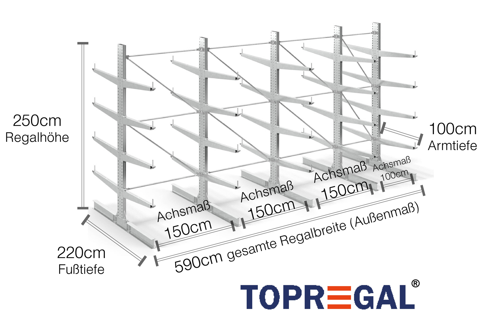 The axial dimension is the internal dimension between two shelf uprights. Depending on the cantilever type, we offer these fields in 120 cm (KR2500) and in 100 cm / 150 cm (KR3000 / KR6000).