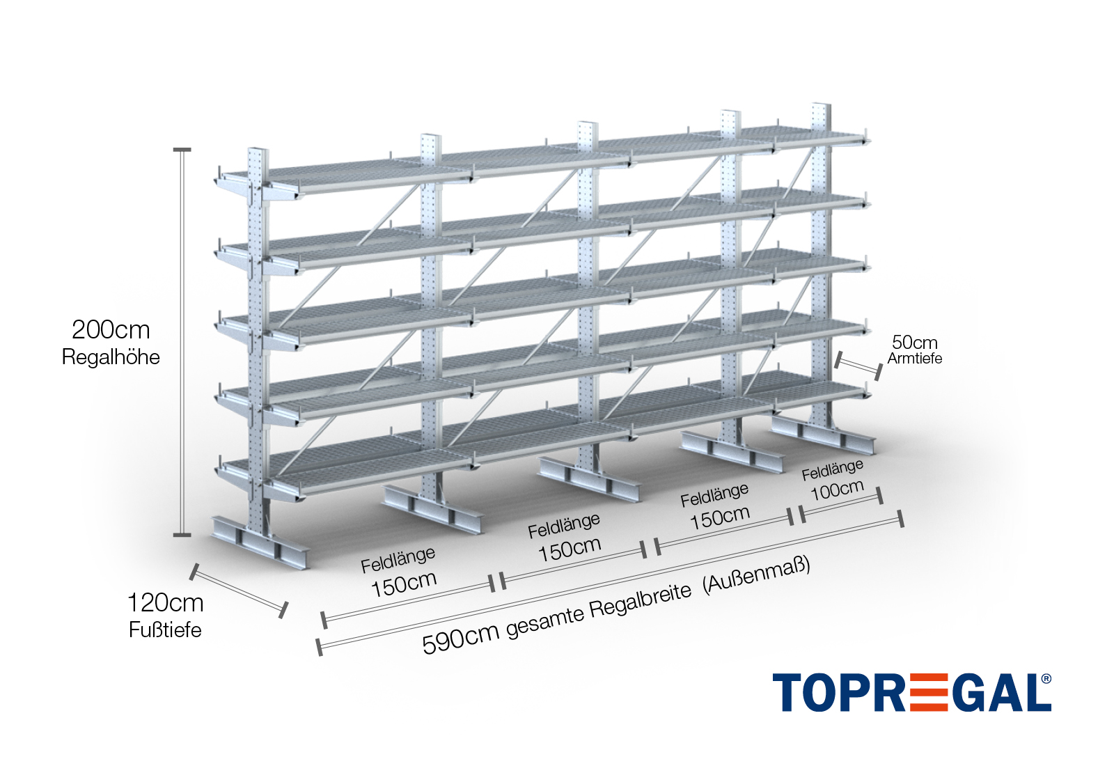 5,9 m cantilever rack KR3000 / Hot-dip galvanised / Double-sided / 2 m high / 50 cm cantilever depth / 5 levels / rack layer Galvanised mesh