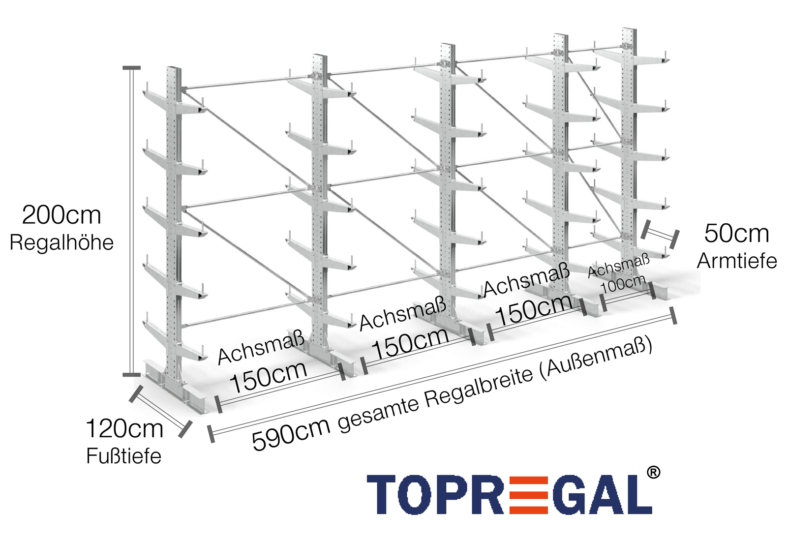 The axial dimension is the internal dimension between two shelf uprights. Depending on the cantilever type, we offer these fields in 120 cm (KR2500) and in 100 cm / 150 cm (KR3000 / KR6000).