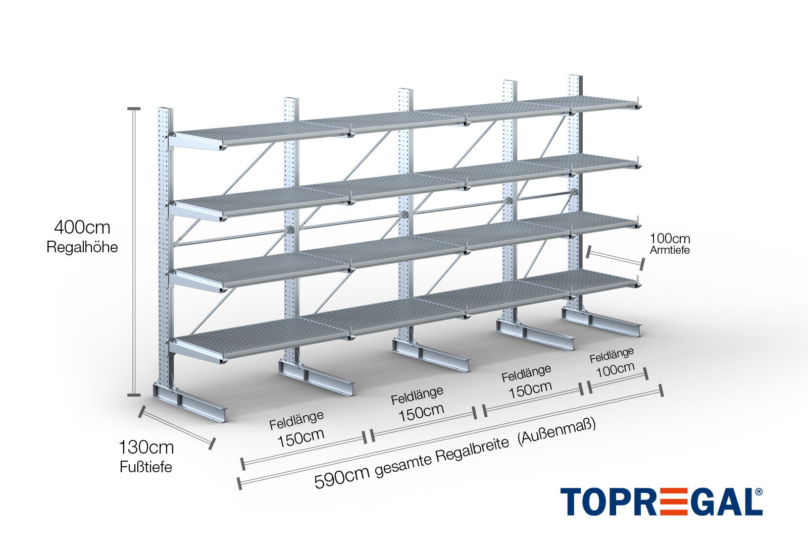 This cantilever rack in a single-sided design with a width of 5,9 m is 4 m high, with an overall depth of 130 cm, and features 4 cantilever levels, with a cantilever depth of 100 cm. The maximum load per cantilever is 500 kg. The cantilevers can be attached at individual heights in increments of 50 mm and are secured with safety bolts and pins. The foot parts can also be used as a storage level (depending on the goods). To protect the load from accidentally slipping, roll-off protection can be attached at the end of each cantilever. This is included as standard in the delivery volume.