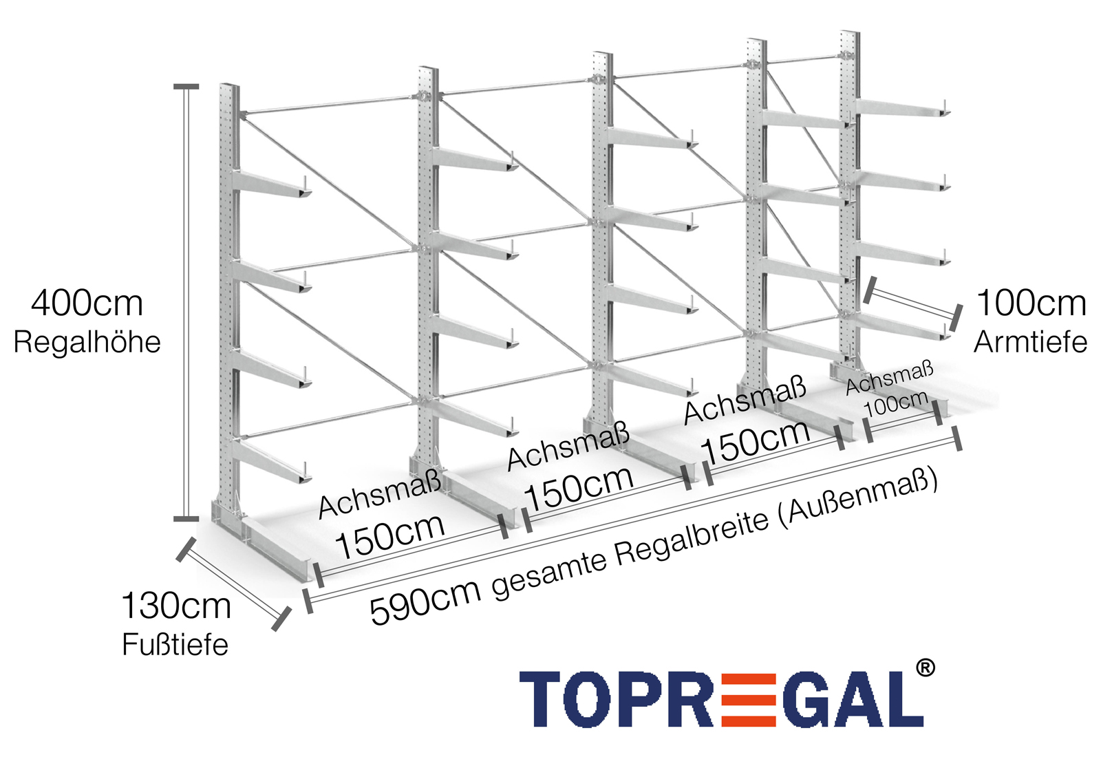 The axial dimension is the internal dimension between two shelf uprights. Depending on the cantilever type, we offer these fields in 120 cm (KR2500) and in 100 cm / 150 cm (KR3000 / KR6000).