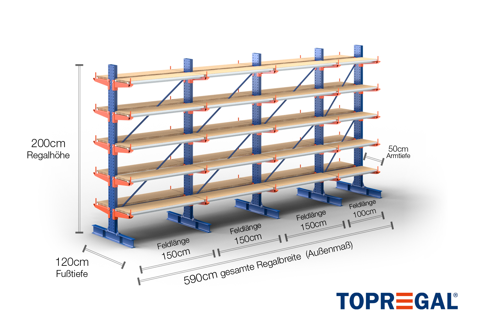 5,9 m cantilever rack KR3000 / Painted / Double-sided / 2 m high / 50 cm cantilever depth / 5 levels / rack layer Wood