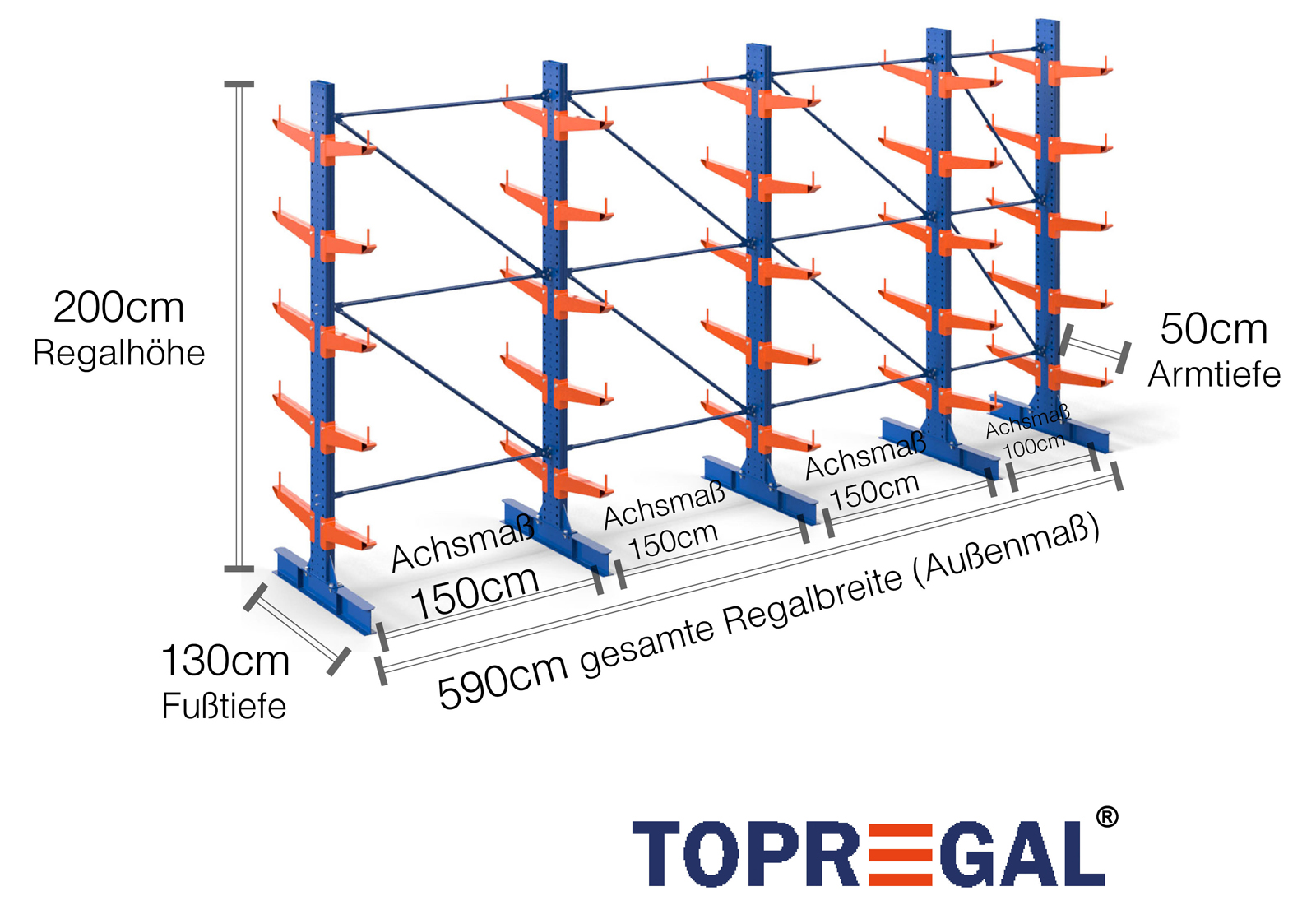 5,9 m cantilever rack KR3000 / Painted / Double-sided / 2 m high / 50 cm cantilever depth / 5 levels