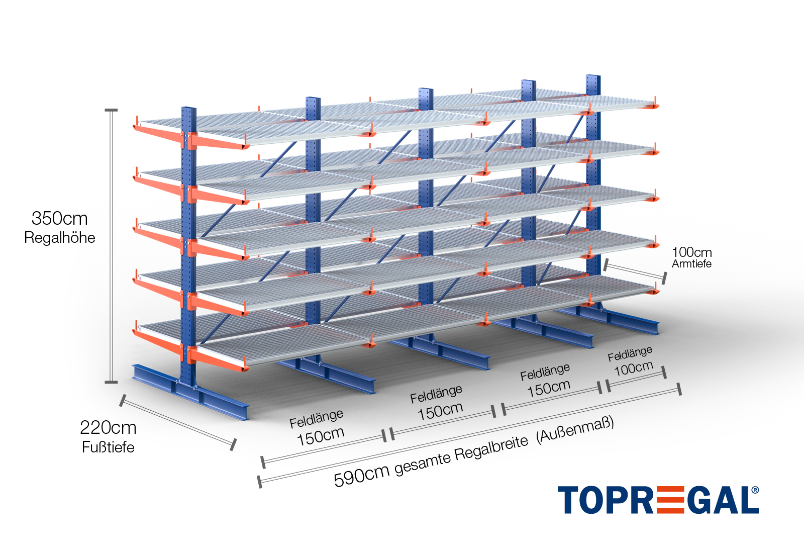 5,9 m cantilever rack KR3000 / Painted / Double-sided / 3,5 m high / 100 cm cantilever depth / 5 levels / rack layer Galvanised mesh