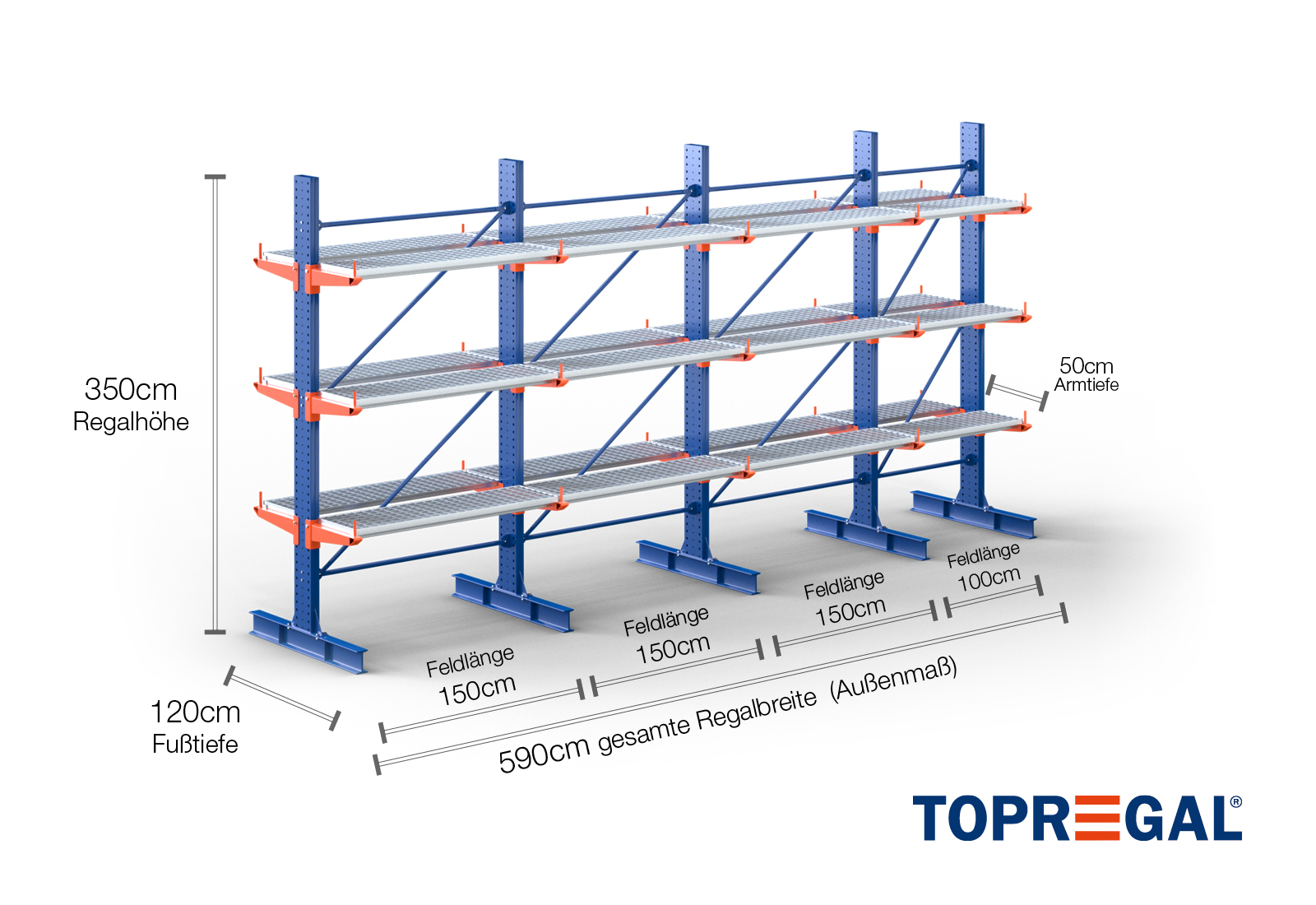 The axial dimension is the internal dimension between two shelf uprights. Depending on the cantilever type, we offer these fields in 120 cm (KR2500) and in 100 cm / 150 cm (KR3000 / KR6000).