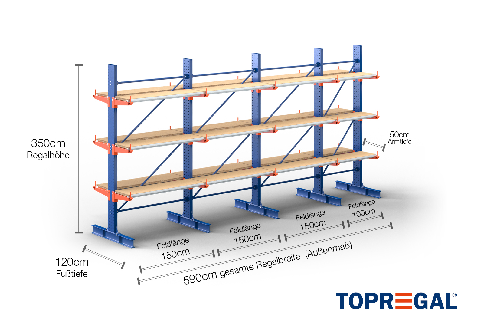 The axial dimension is the internal dimension between two shelf uprights. Depending on the cantilever type, we offer these fields in 120 cm (KR2500) and in 100 cm / 150 cm (KR3000 / KR6000).