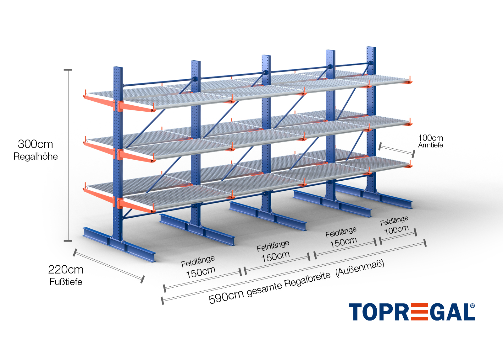 The axial dimension is the internal dimension between two shelf uprights. Depending on the cantilever type, we offer these fields in 120 cm (KR2500) and in 100 cm / 150 cm (KR3000 / KR6000).