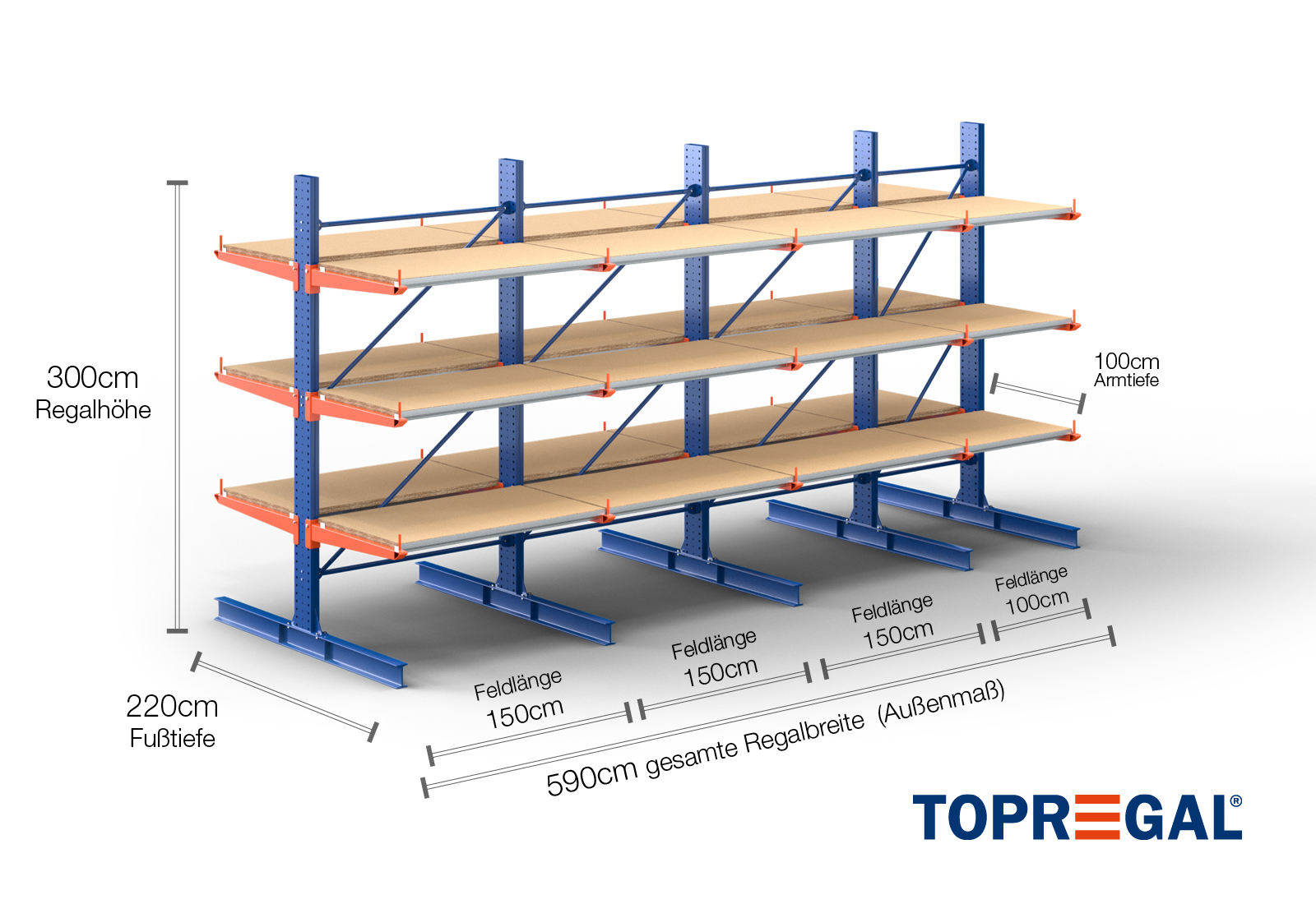 5,9 m cantilever rack KR3000 / Painted / Double-sided / 3 m high / 100 cm cantilever depth / 3 levels / rack layer Wood