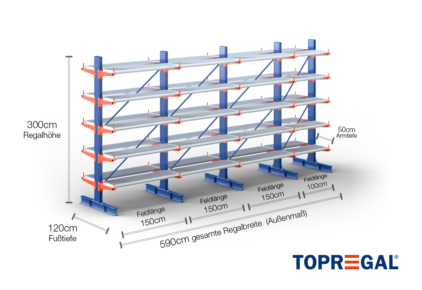 5,9 m cantilever rack KR3000 / Painted / Double-sided / 3 m high / 50 cm cantilever depth / 5 levels / rack layer Galvanised mesh