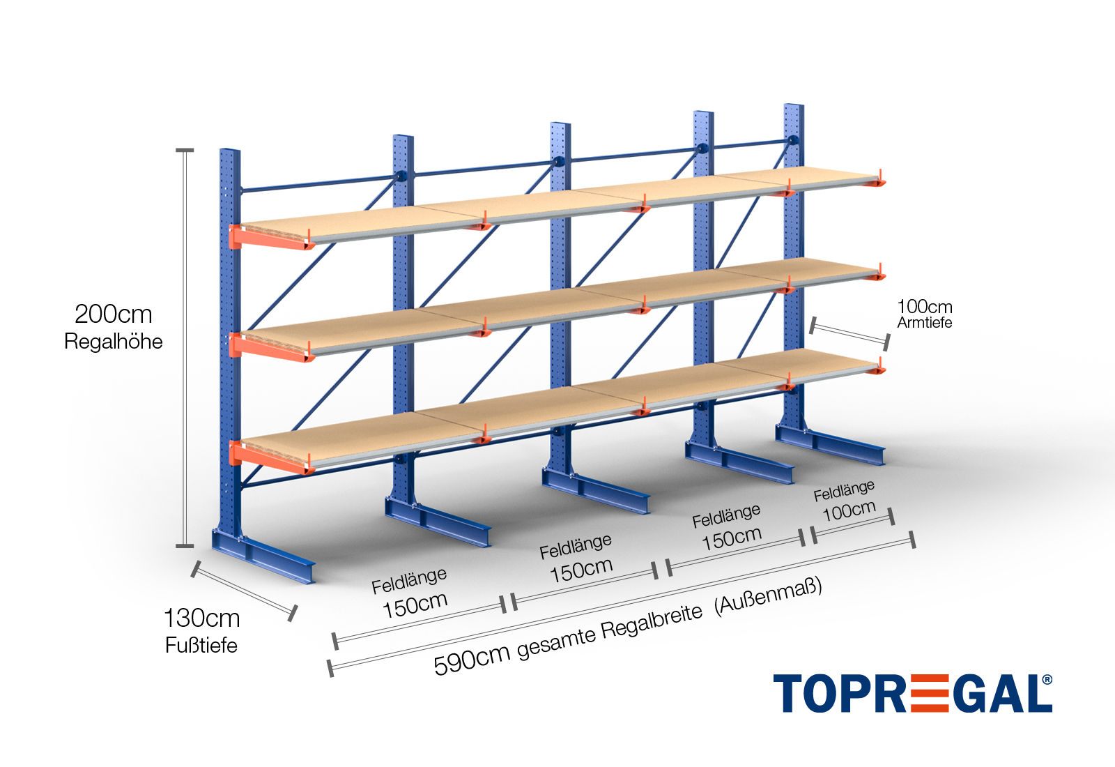 The axial dimension is the internal dimension between two shelf uprights. Depending on the cantilever type, we offer these fields in 120 cm (KR2500) and in 100 cm / 150 cm (KR3000 / KR6000).