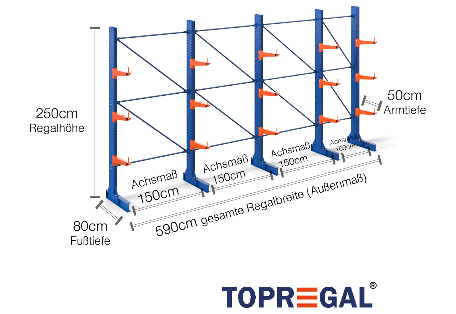 The axial dimension is the internal dimension between two shelf uprights. Depending on the cantilever type, we offer these fields in 120 cm (KR2500) and in 100 cm / 150 cm (KR3000 / KR6000).