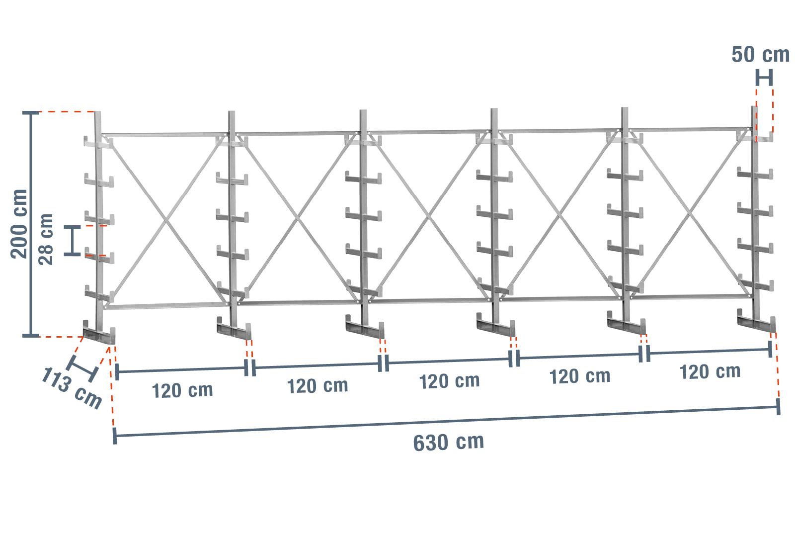 The individual uprights are bolted together using 2 cross and diagonal braces (centre-to-centre distance 1.200 mm). Each cantilever arm has a support width of 30 mm and is equipped with a 50 mm high roll-off guard. The 50 cm long base has a support depth of 50 cm, a support width of 50 mm and a 70 mm high roll-off guard. This means that the bases can also be used as storage levels.