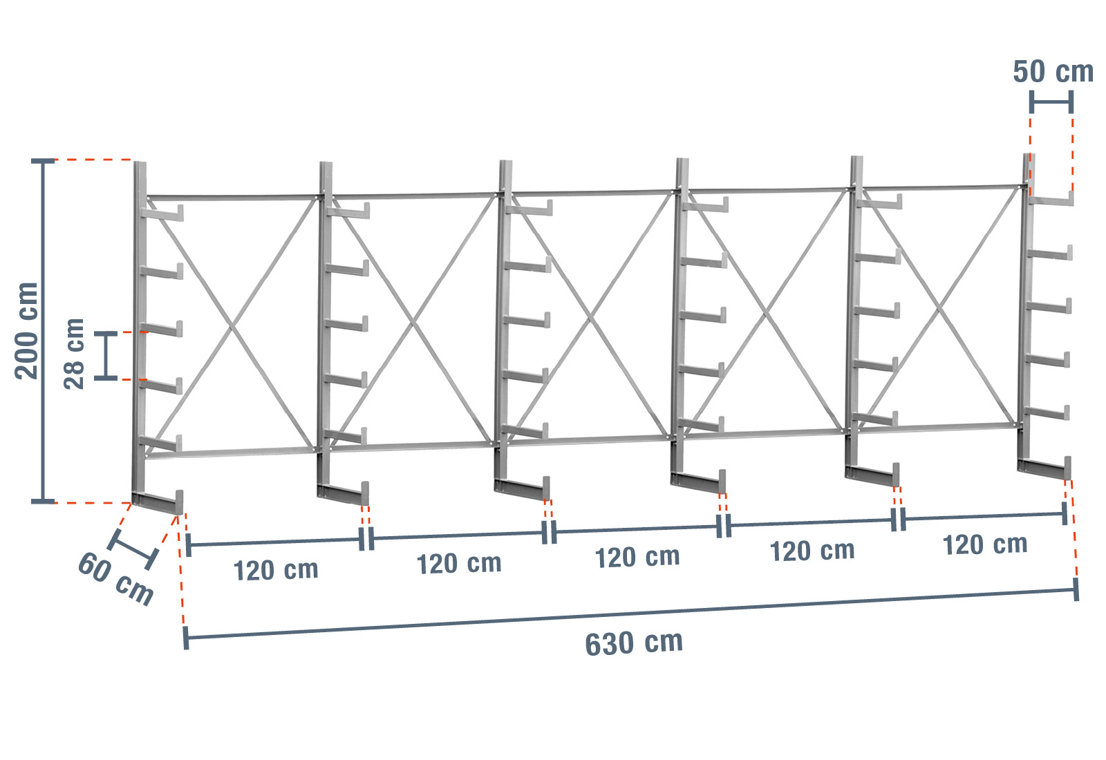 This extra-robust cantilever rack with a width of 6,3 m is 2 m high and has 5 levels with a cantilever depth of 50 cm. Thanks to the single-sided design with welded-on cantilever arms, you can load each upright with a maximum of 1.250 kg, where each cantilever has a maximum load of 250 kg.