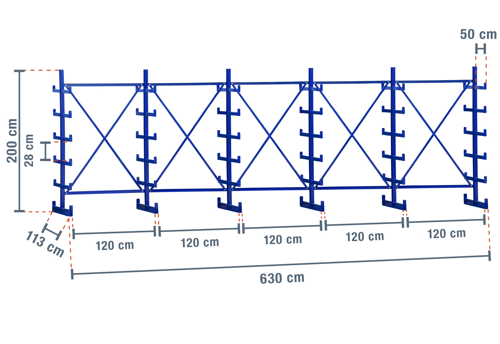 This extra-robust cantilever rack with a width of 6,3 m is 2 m high and has 5 levels with a cantilever depth of 50 cm. Thanks to the double-sided design with welded-on cantilever arms, you can load each upright with a maximum of 2.500 kg, where each cantilever has a maximum load of 250 kg.